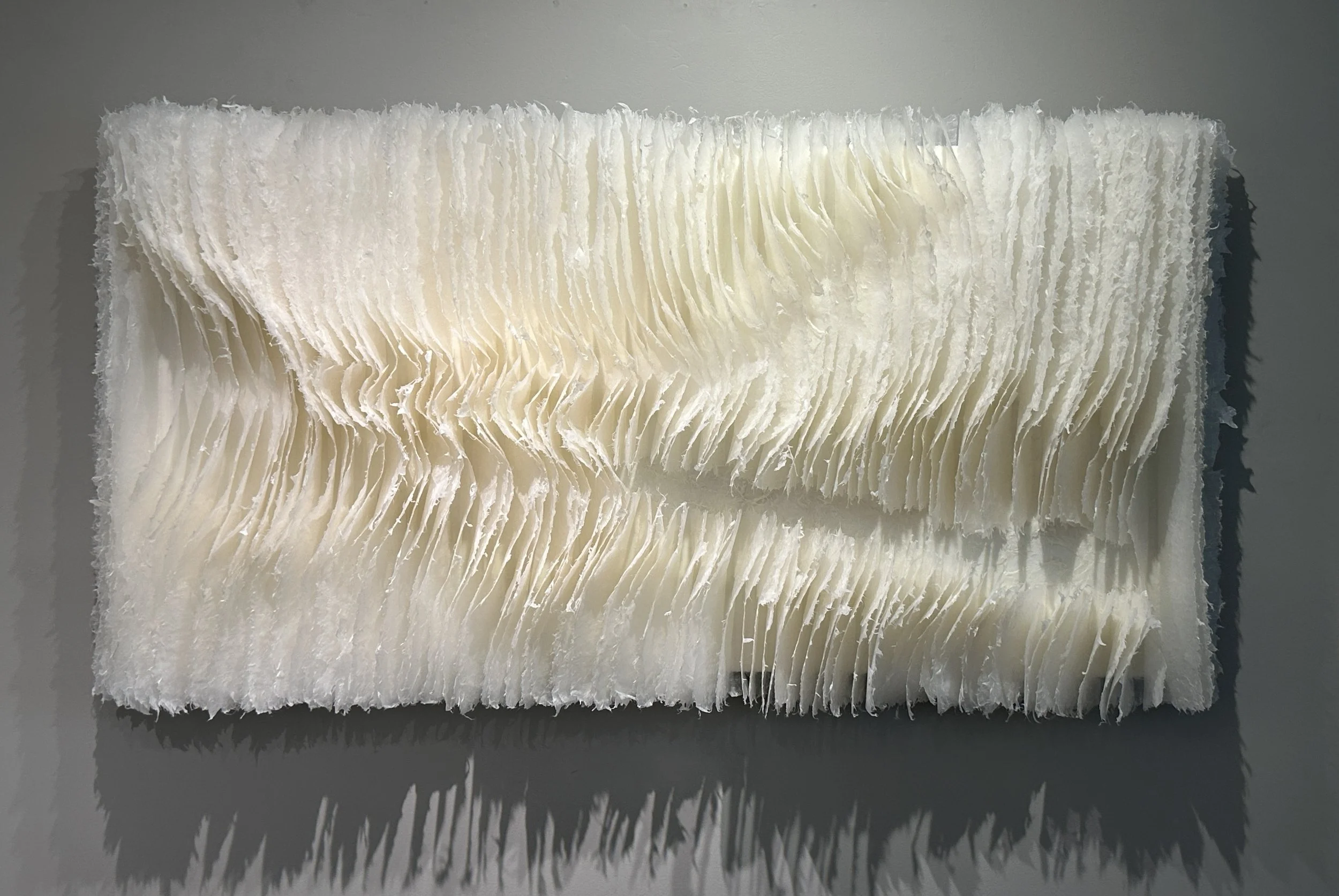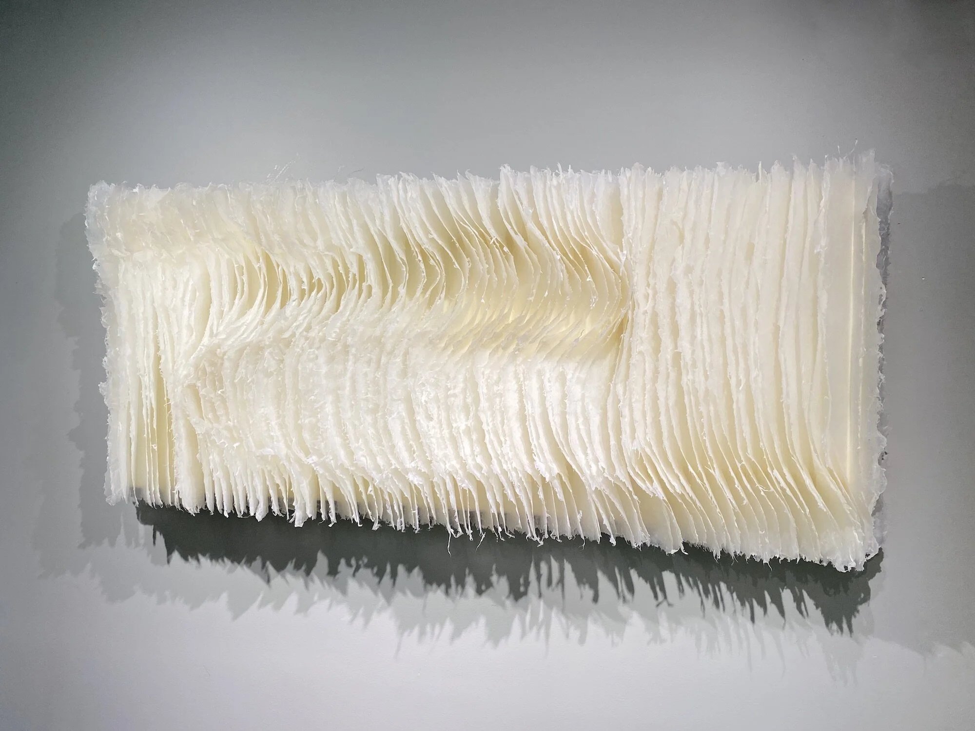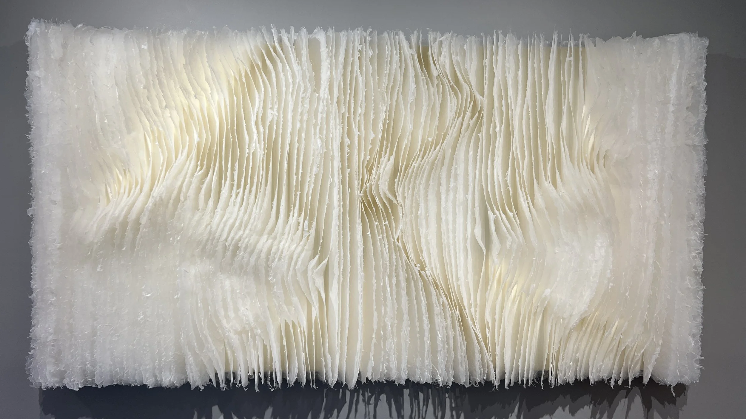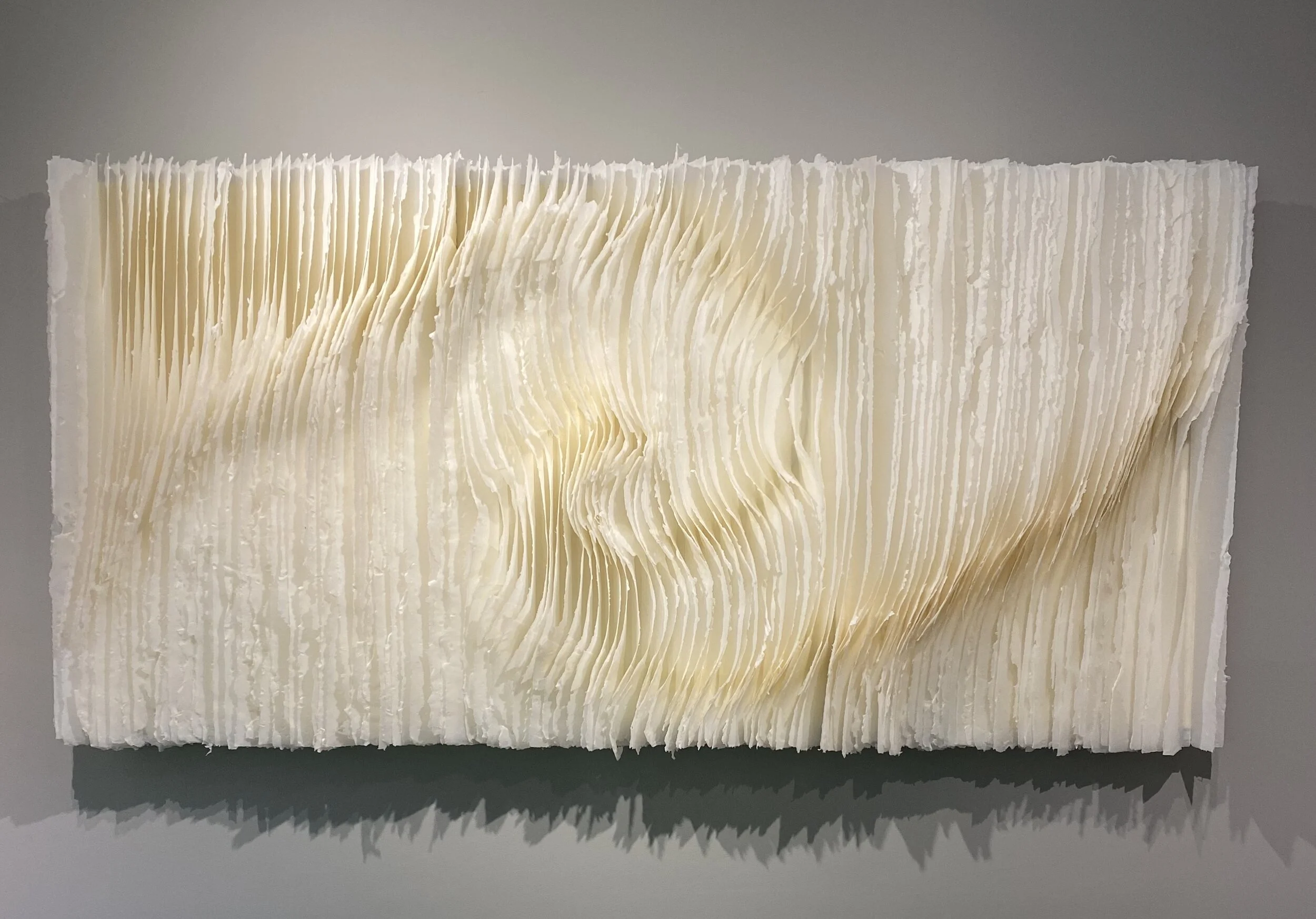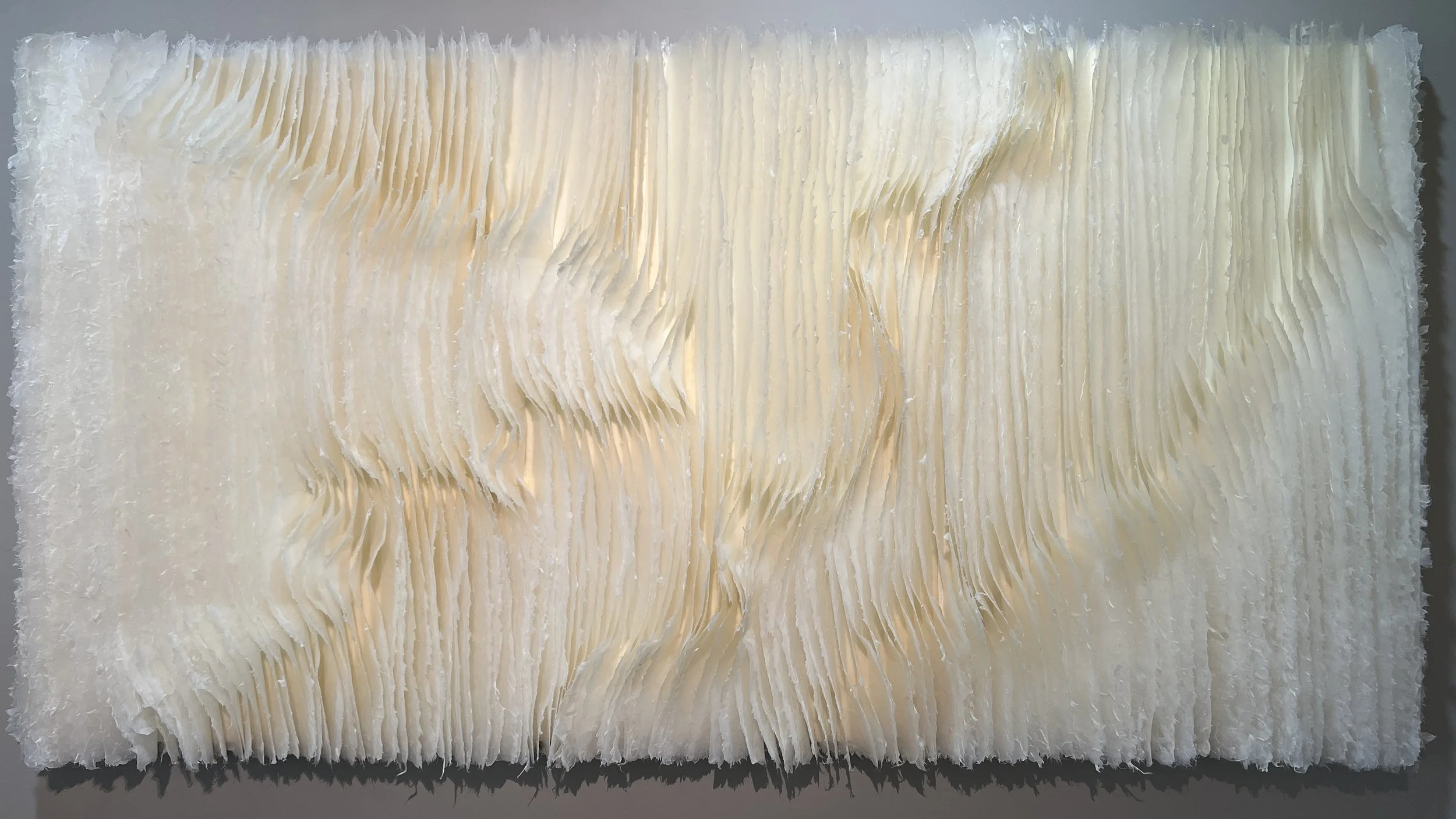 Encaustic sculpture from artist-made Kozo paper, on birch panel, 2022, 50 x 80 x 5 inches
