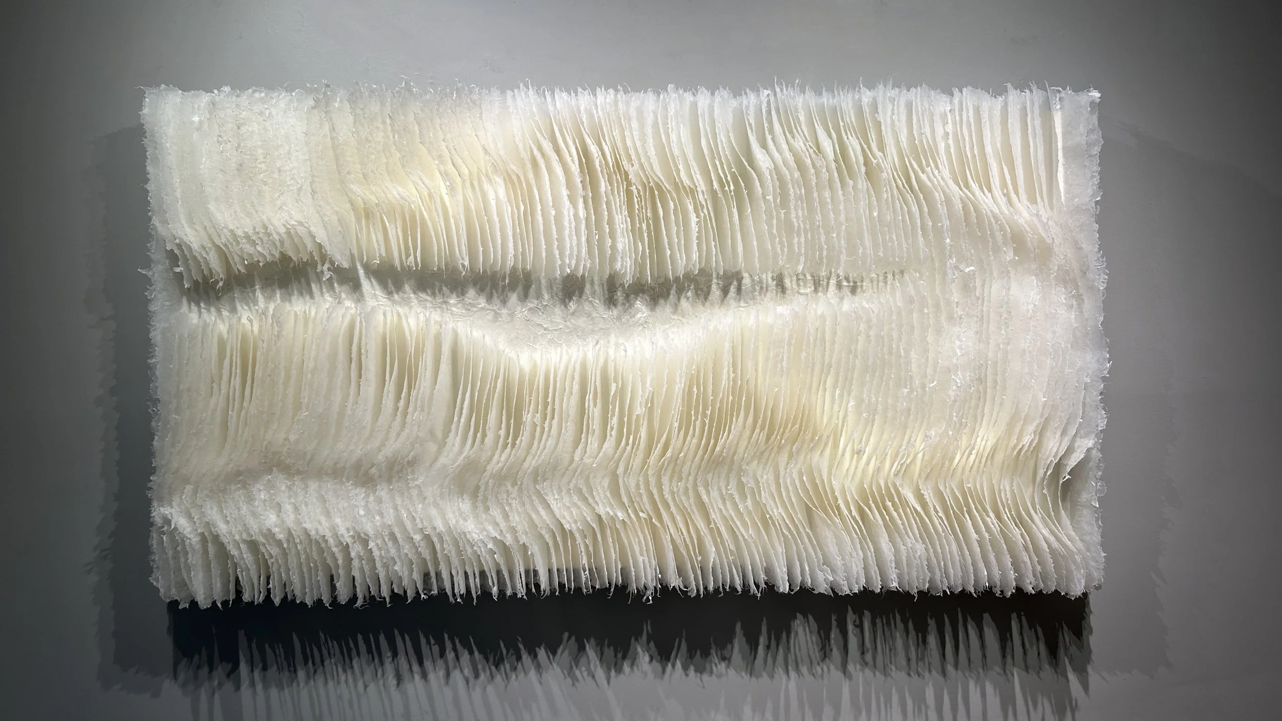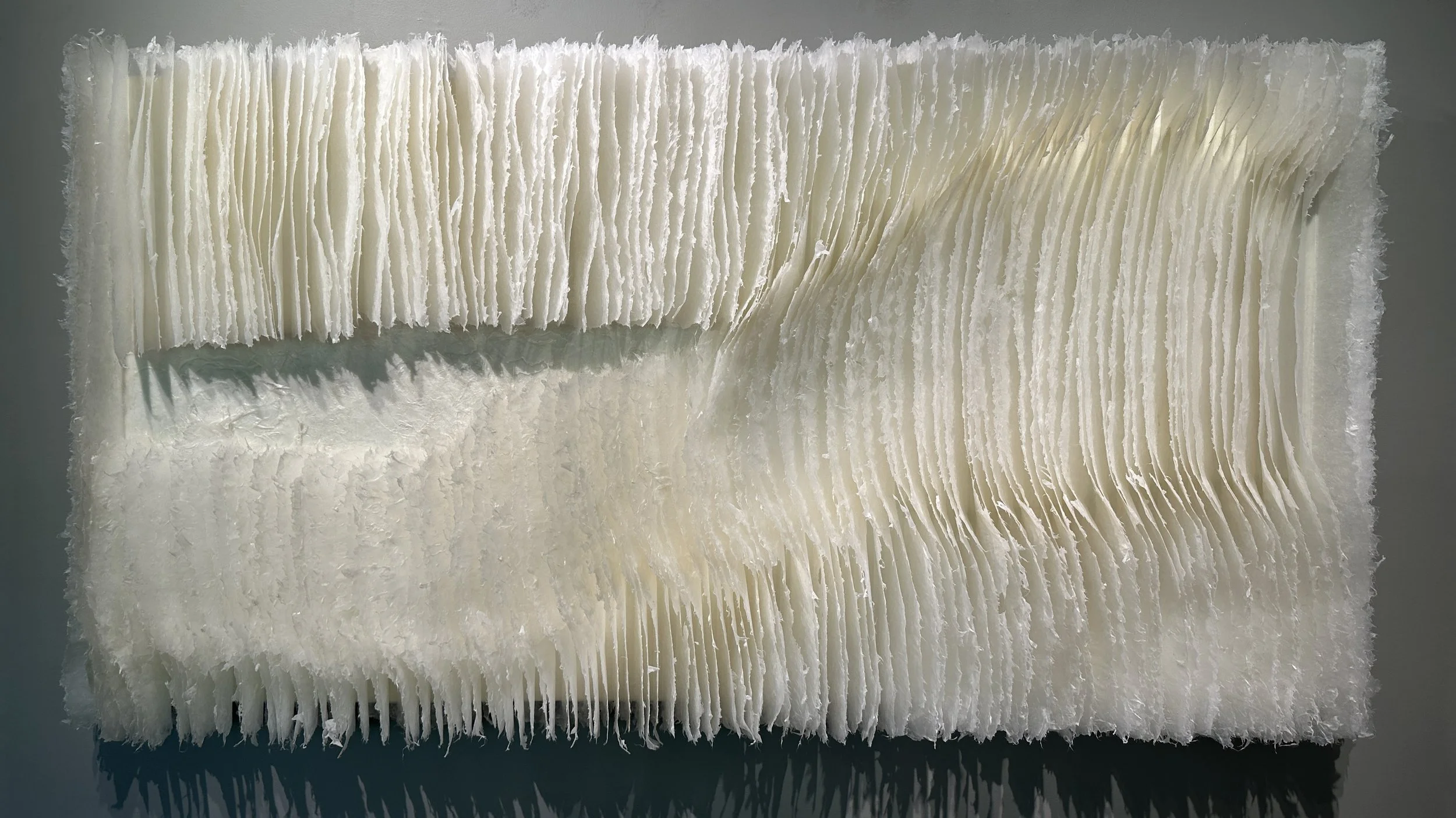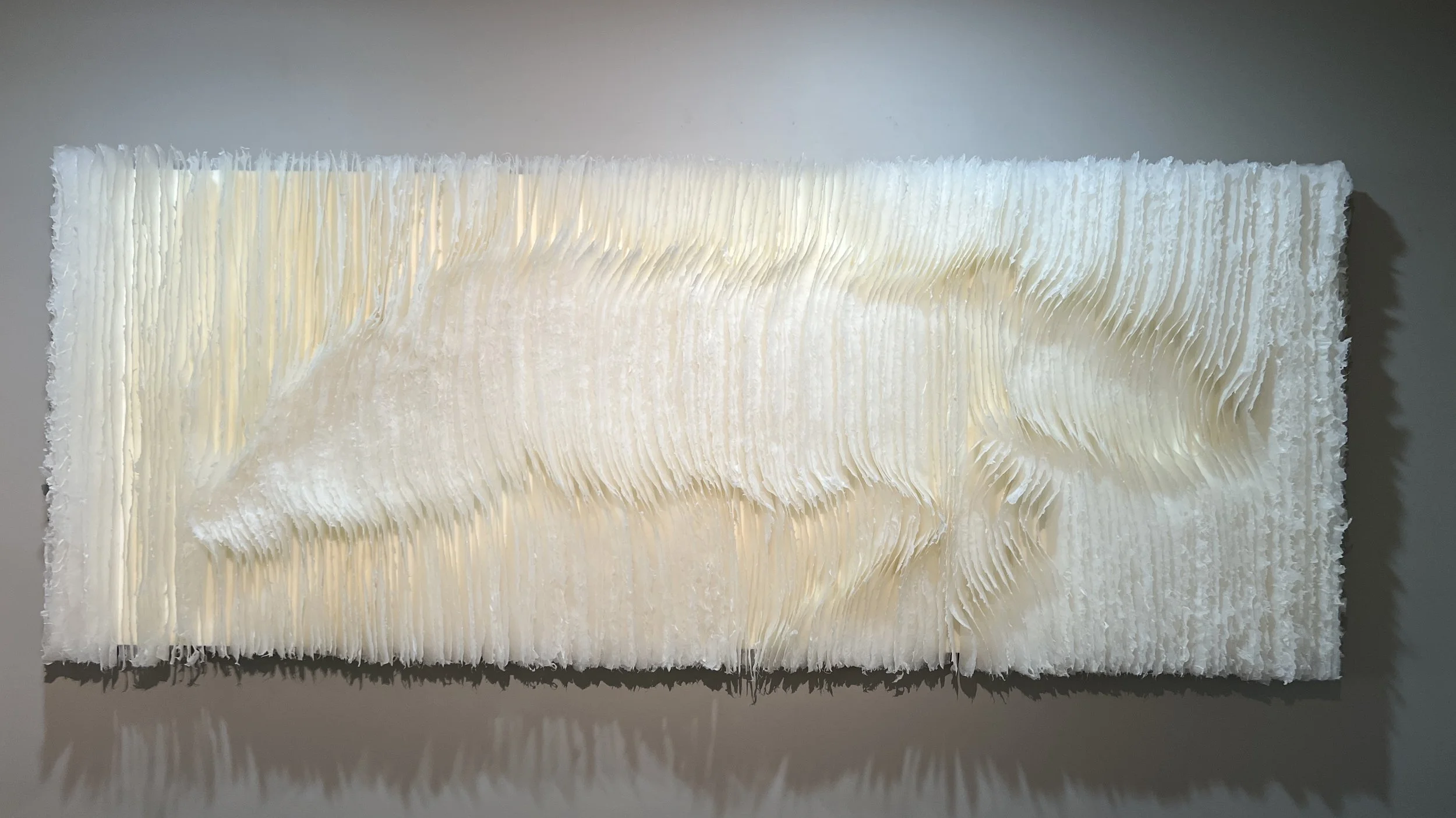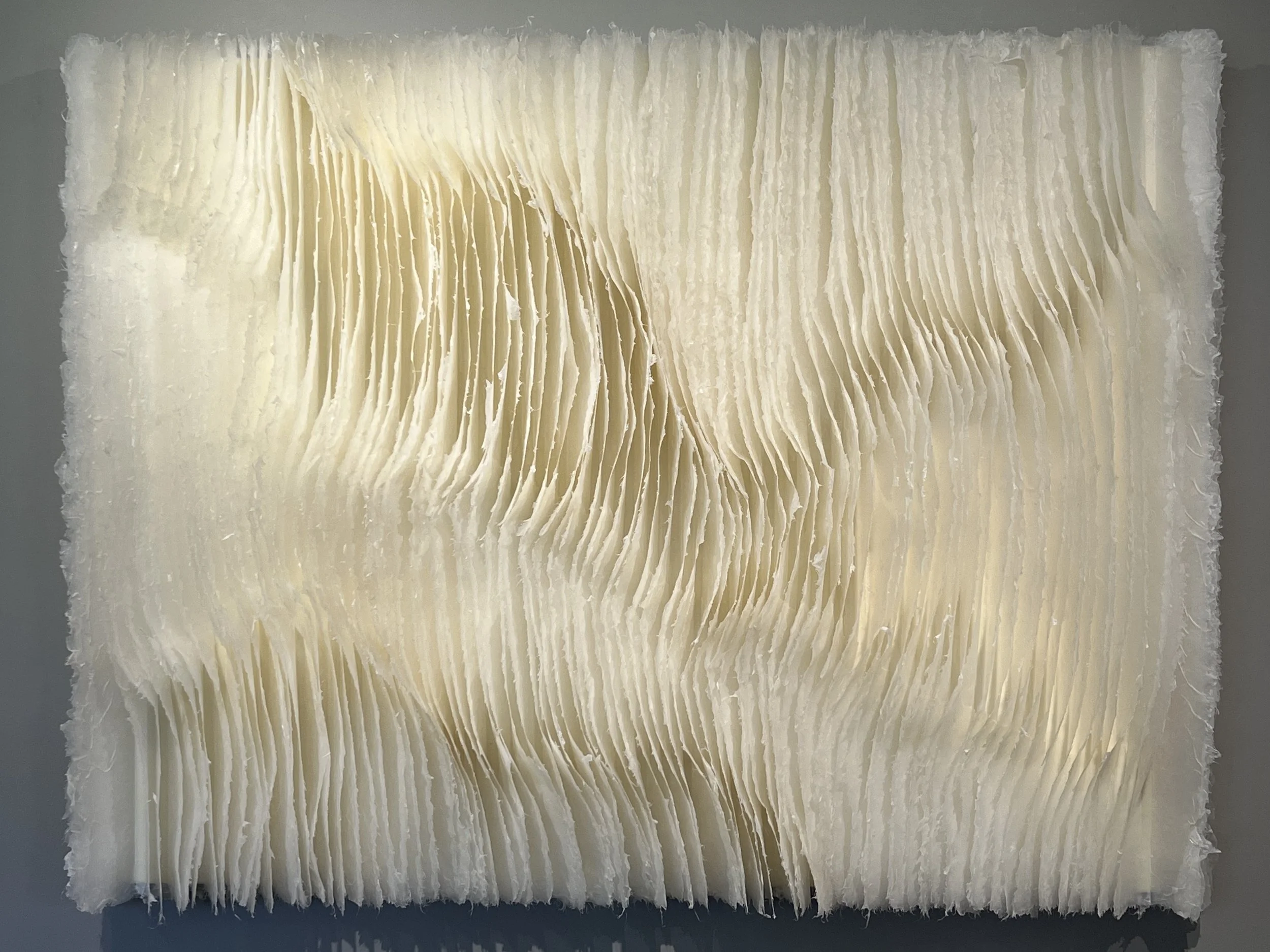 Encaustic sculpture from artist-made Kozo paper, on birch panel, 2022, 50 x 80 x 5 inches