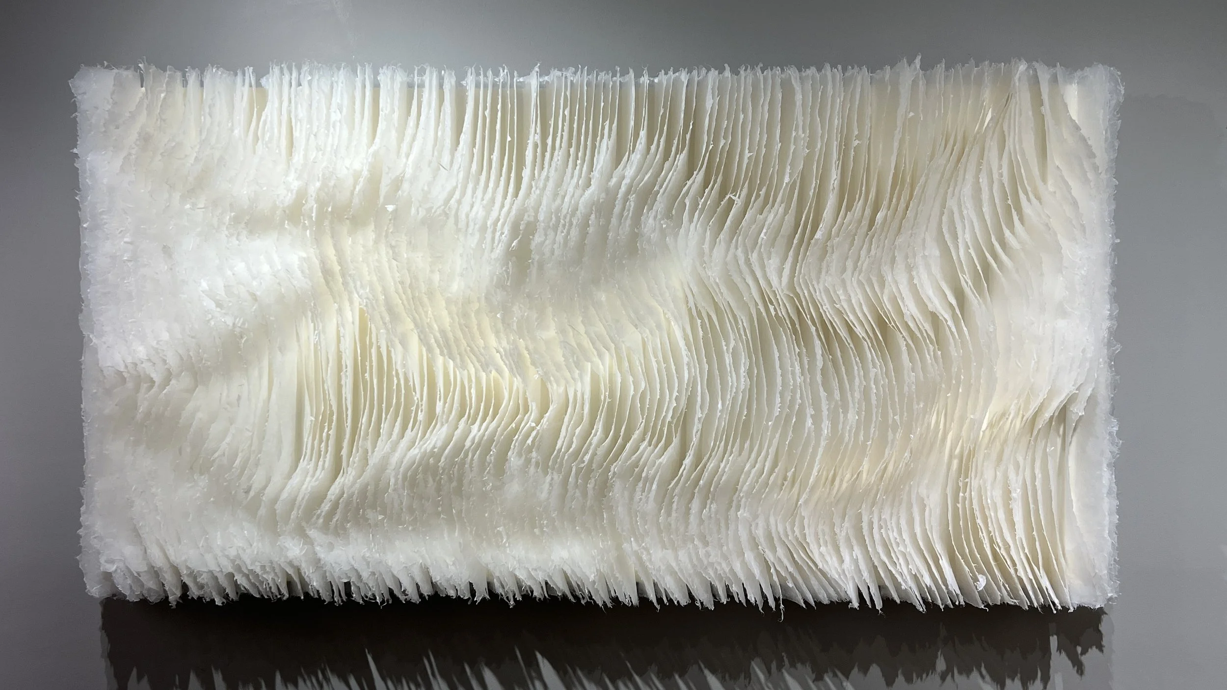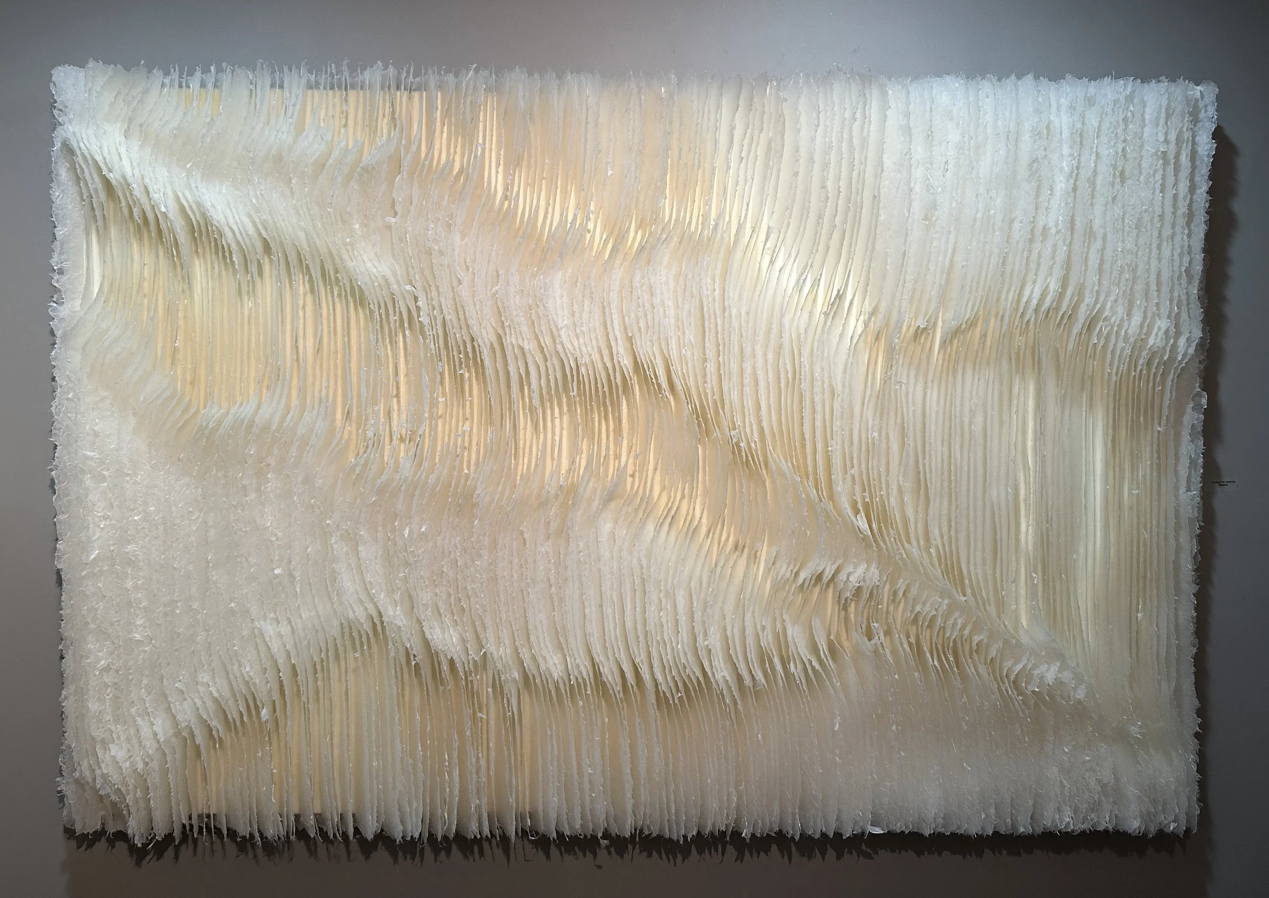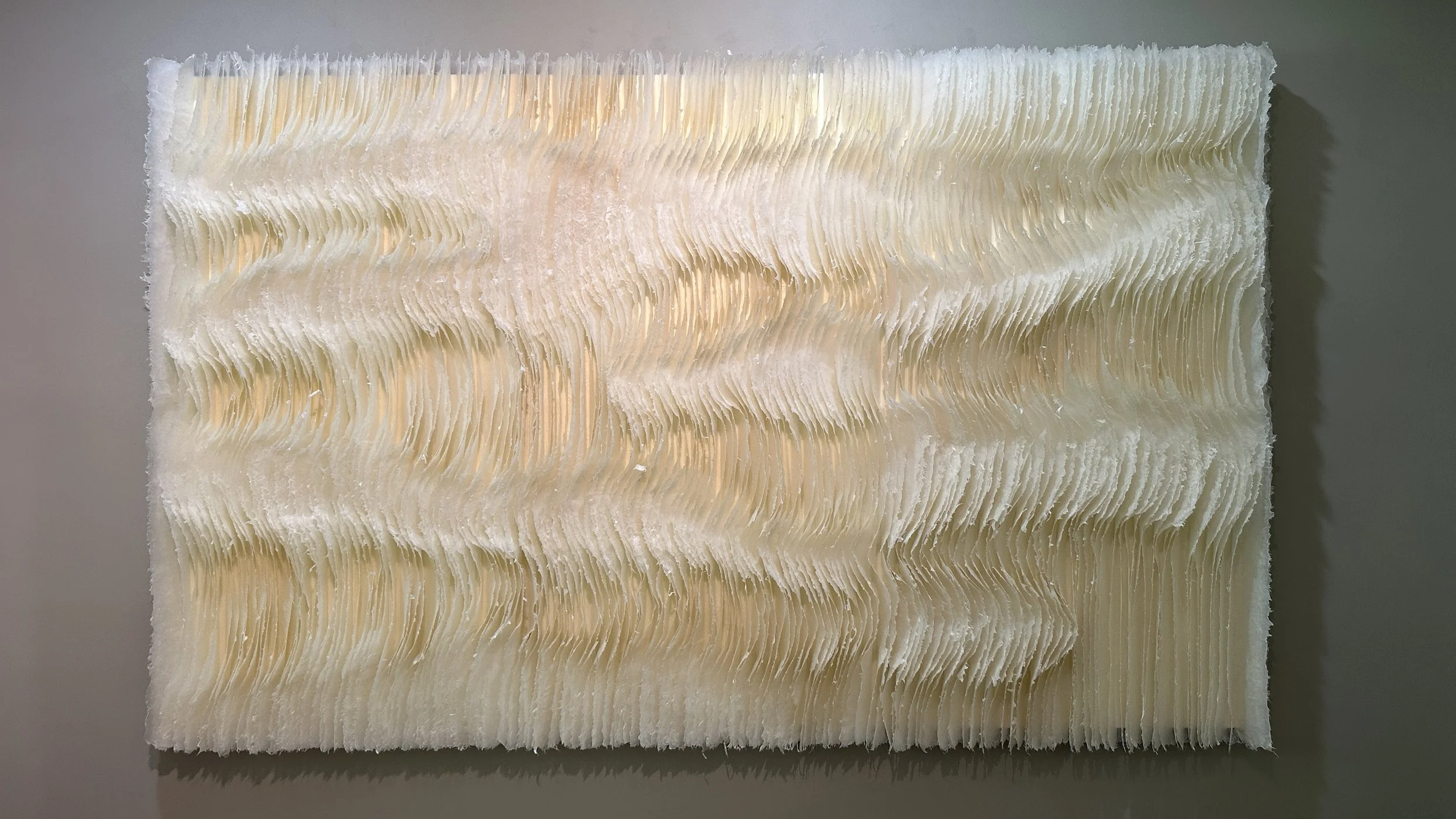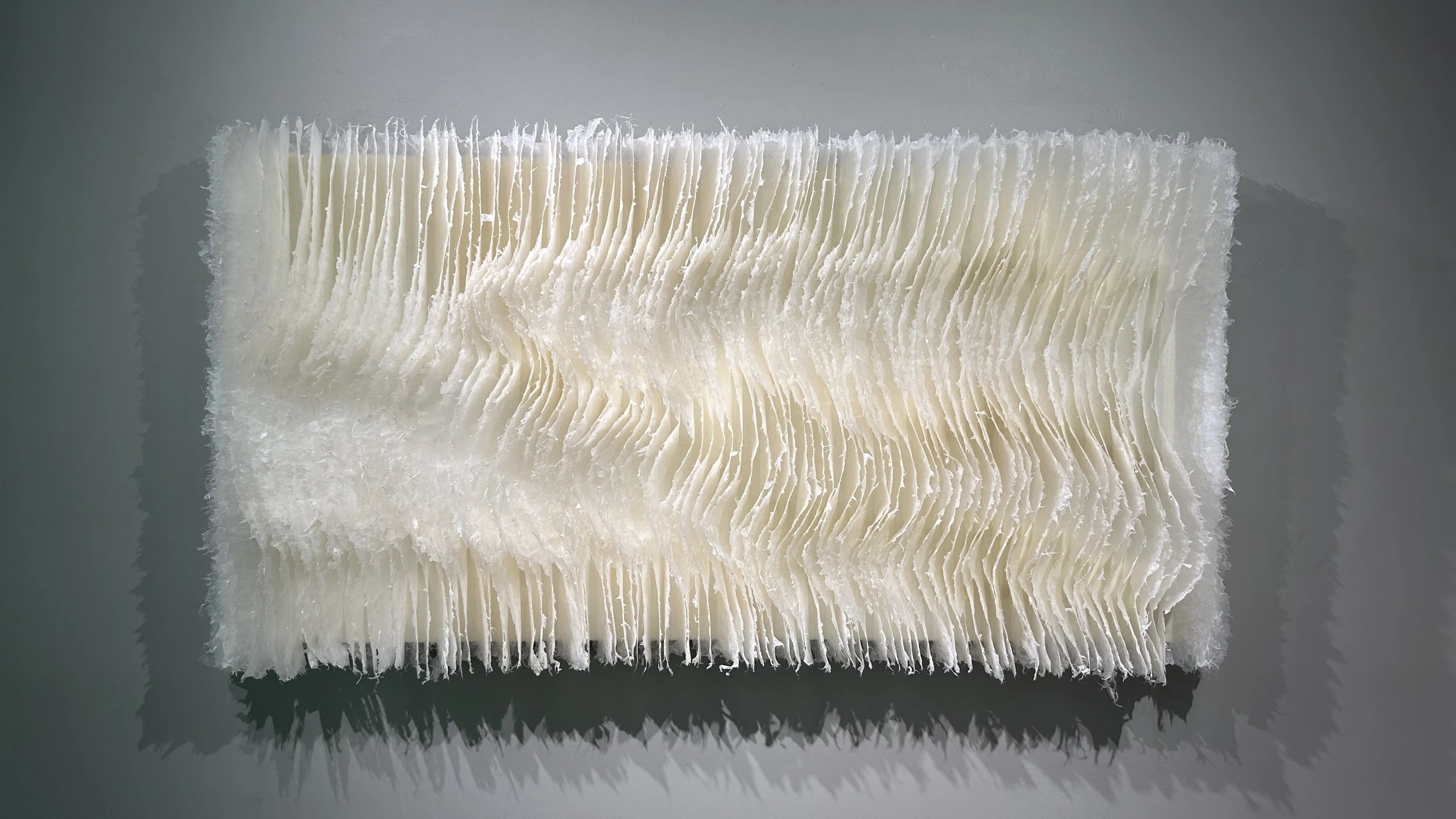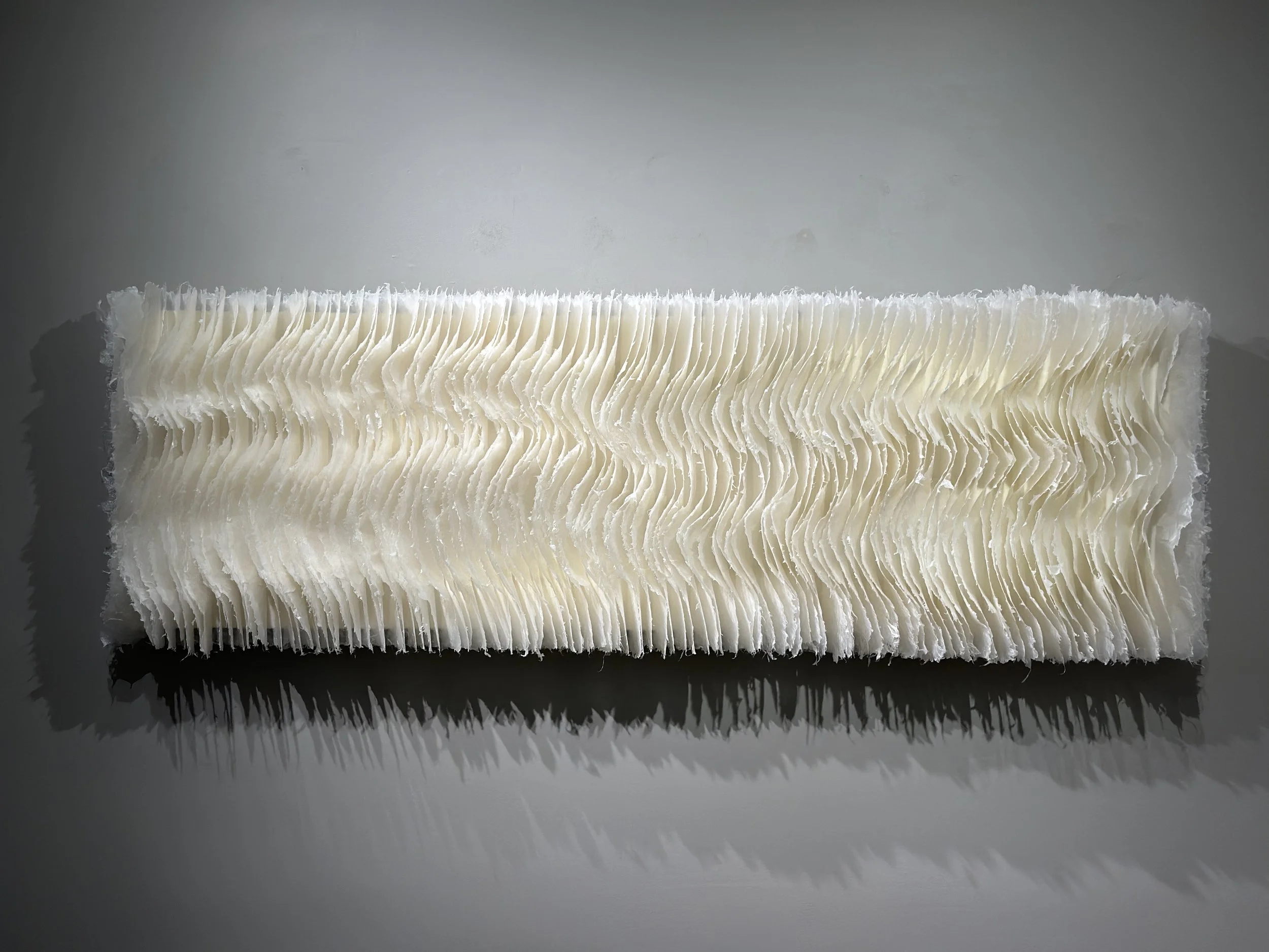 Encaustic sculpture from artist-made Kozo paper, on birch panel, 2022, 50 x 80 x 5 inches