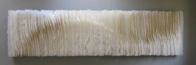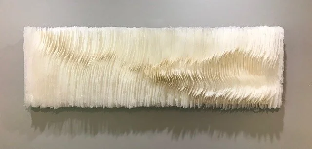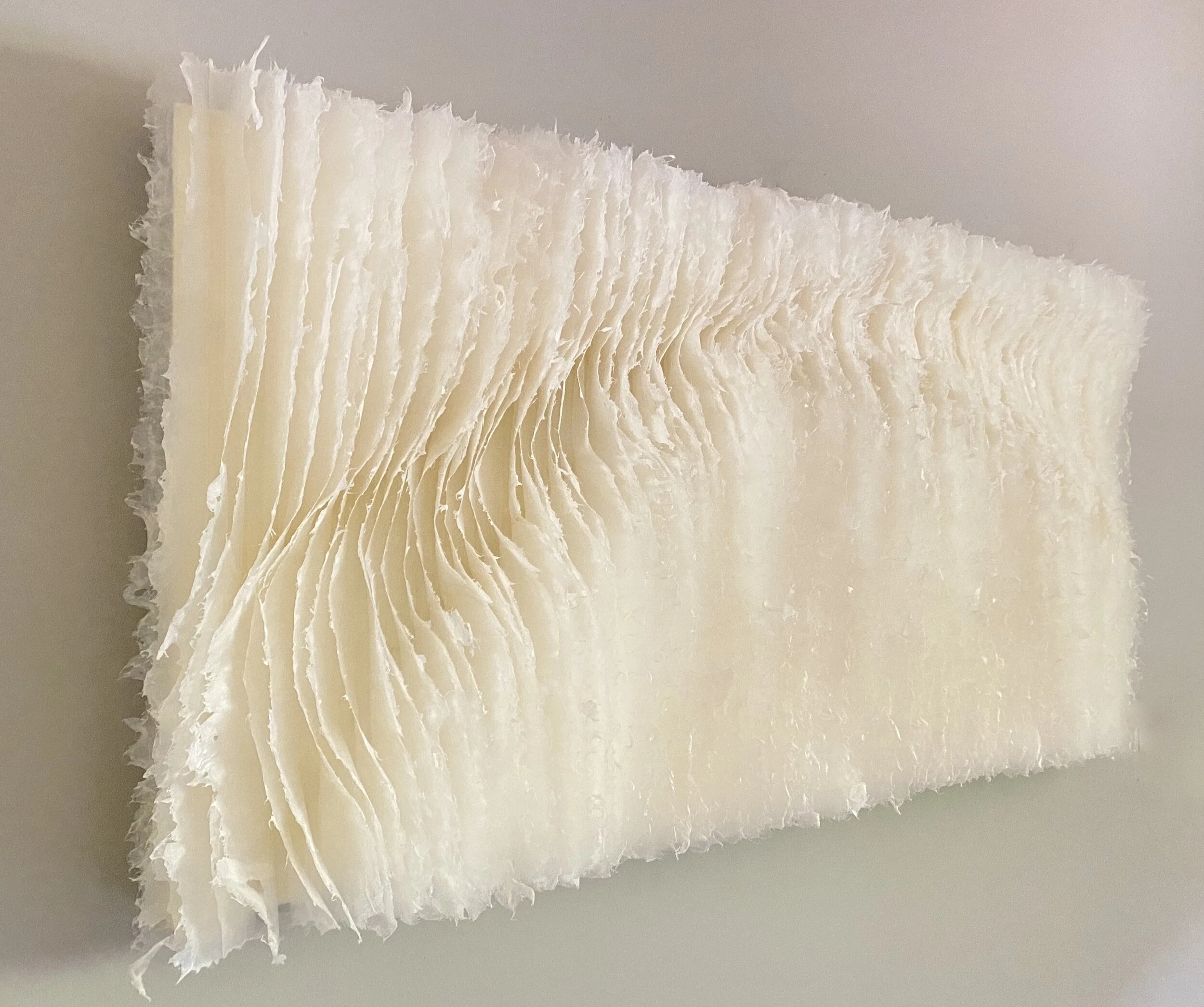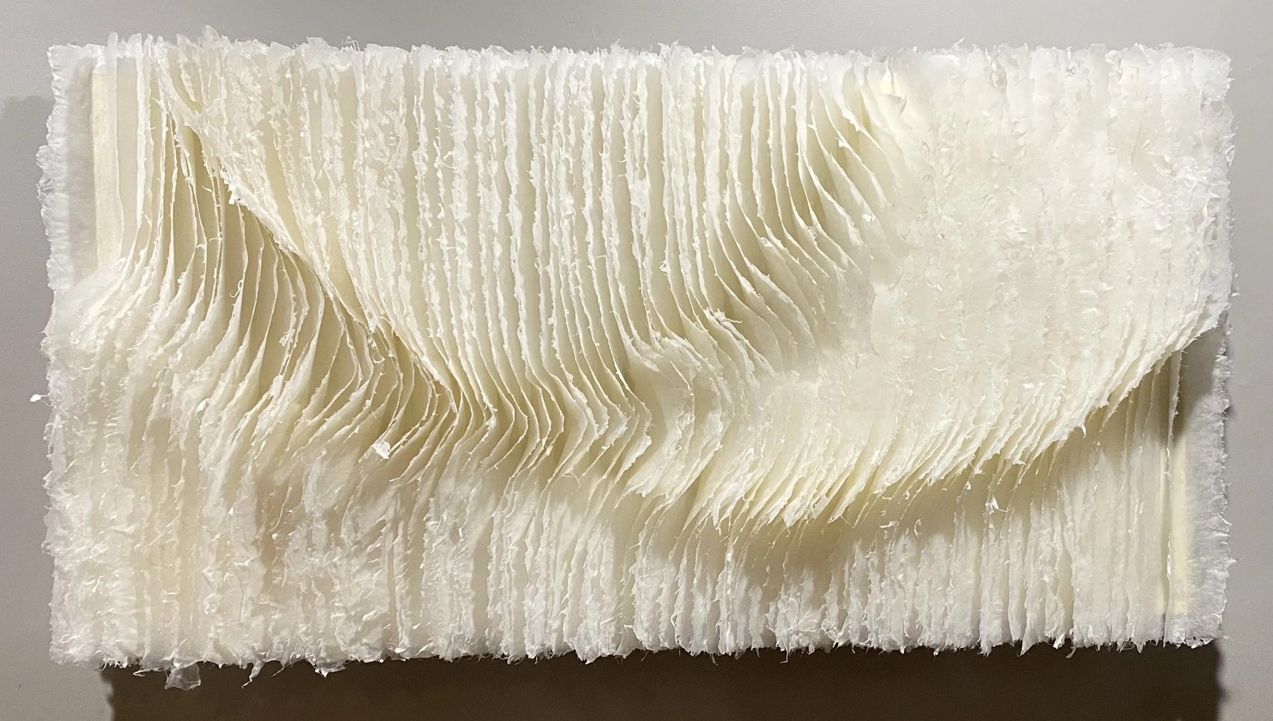 Encaustic sculpture from artist-made Kozo paper, on birch panel, 2021, 25 x 50 x 5 inches