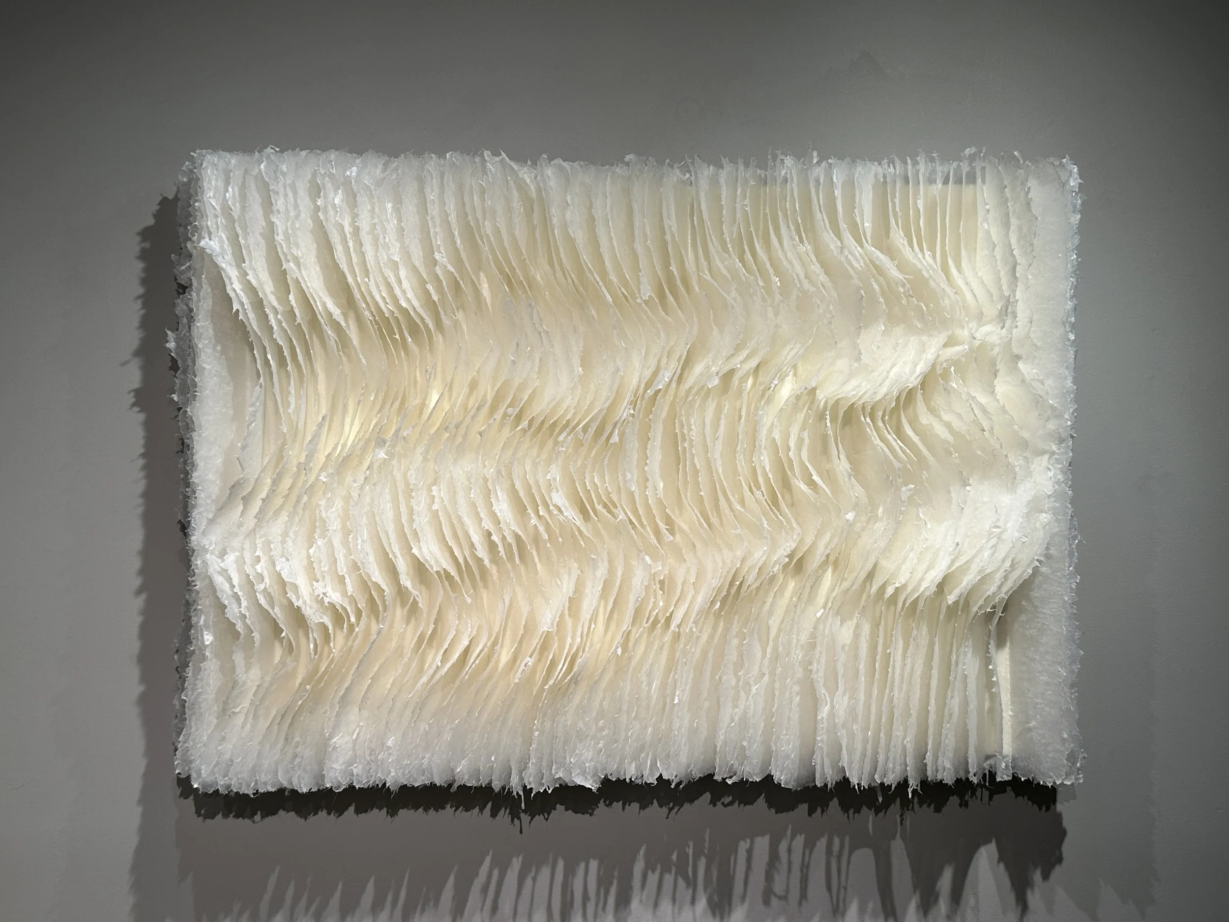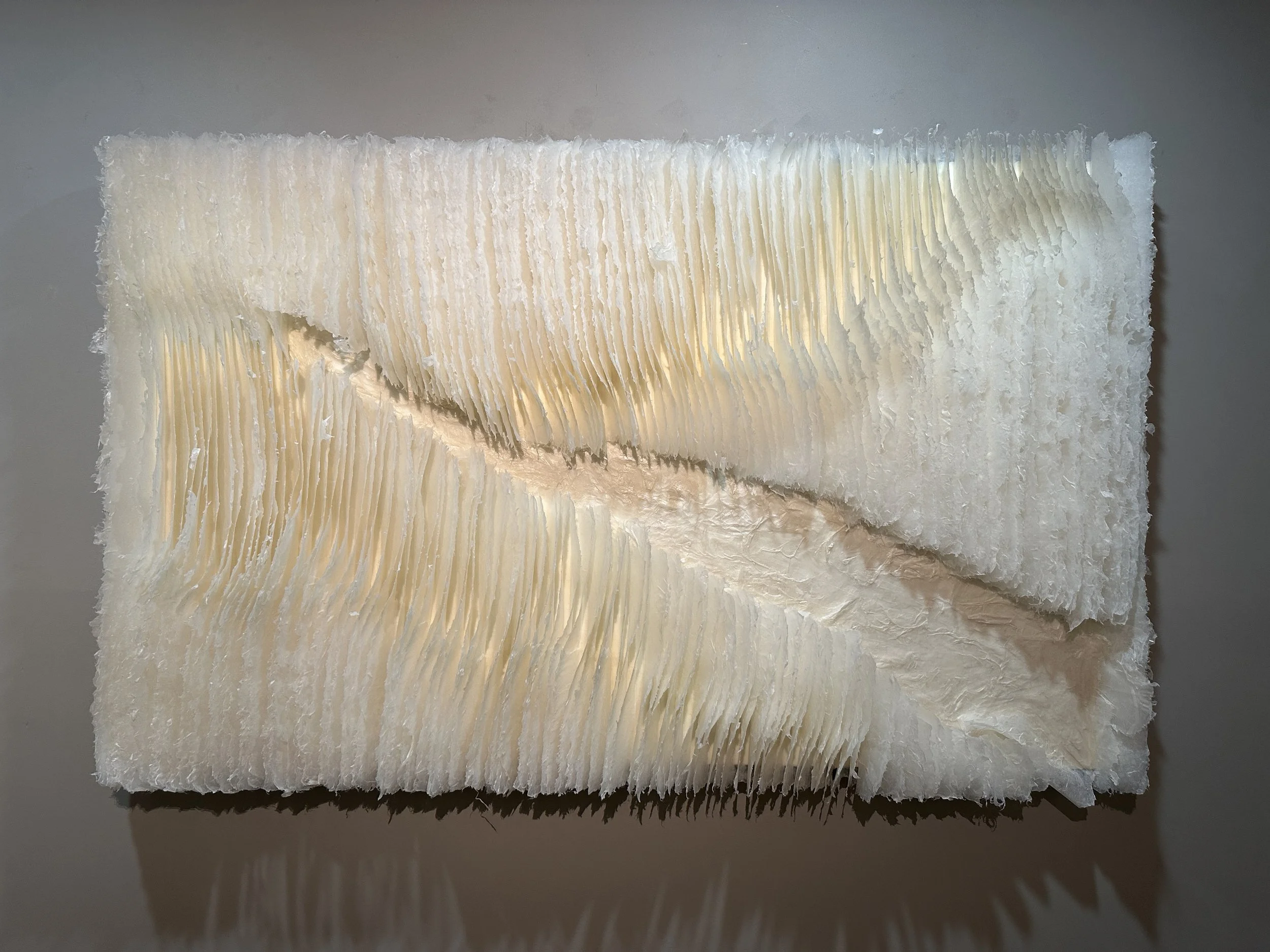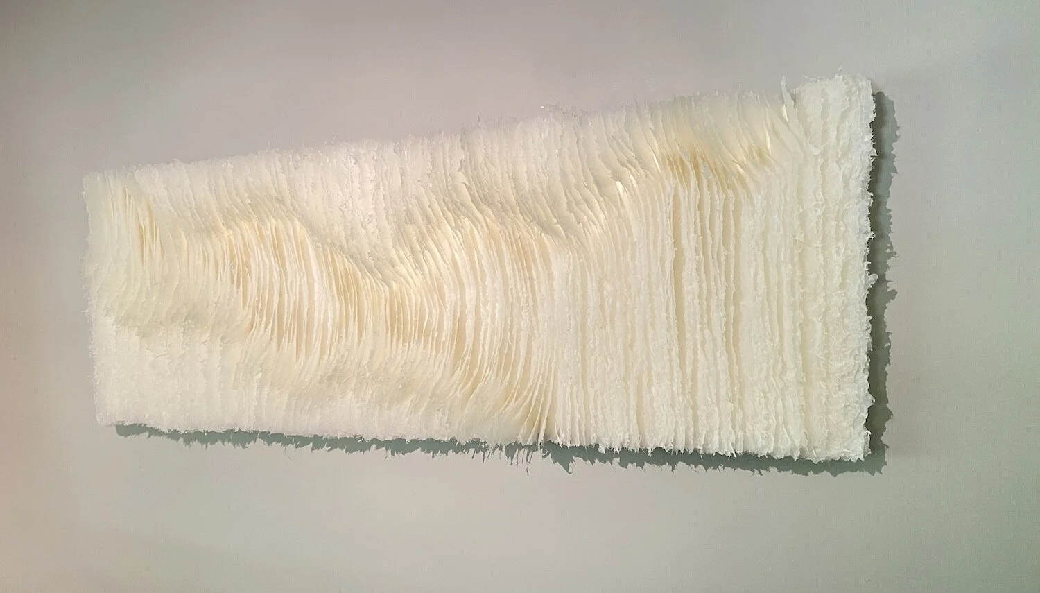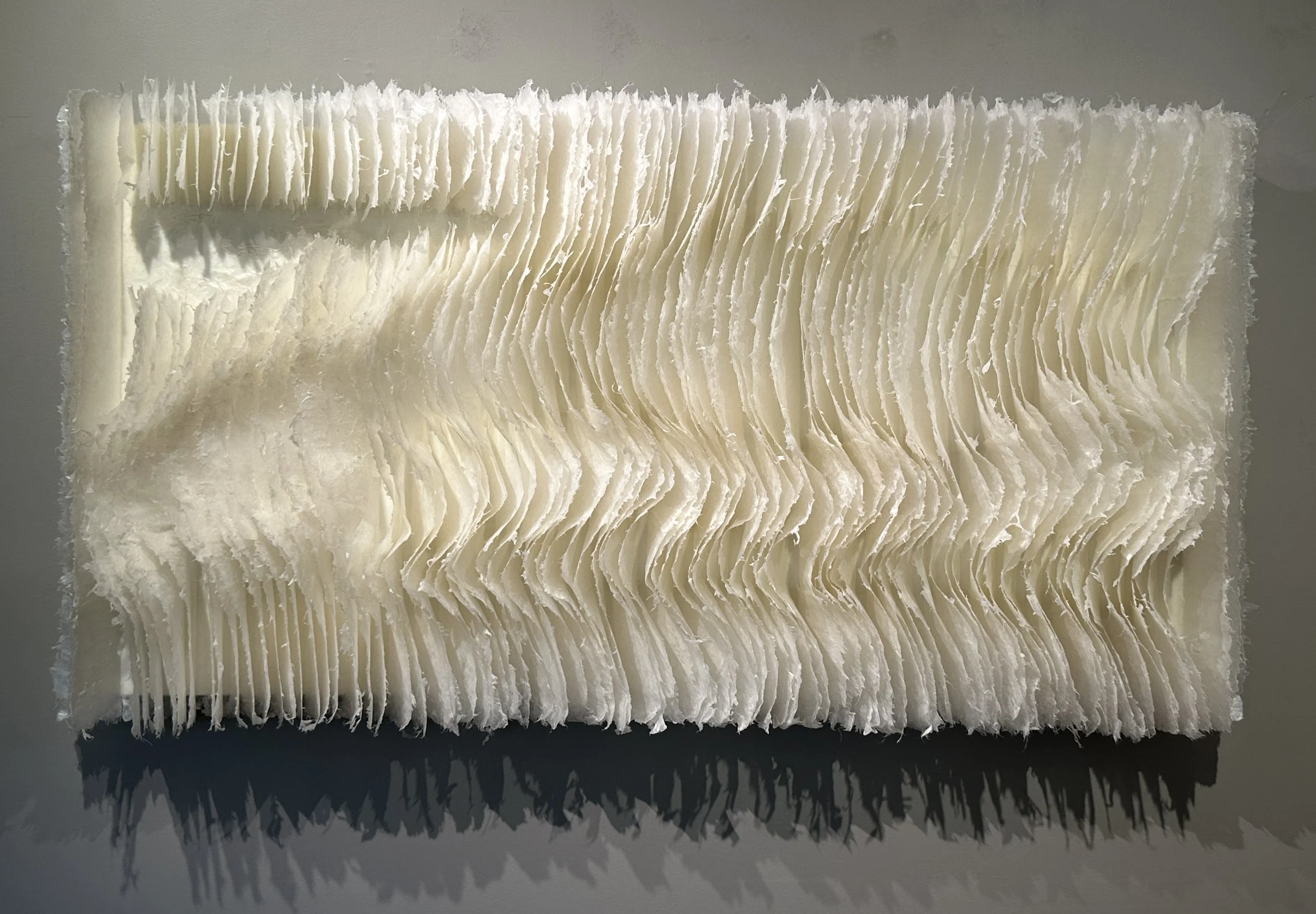 Encaustic sculpture from artist-made Kozo paper, on birch panel, 2024, 58 x 92 x 5 inches