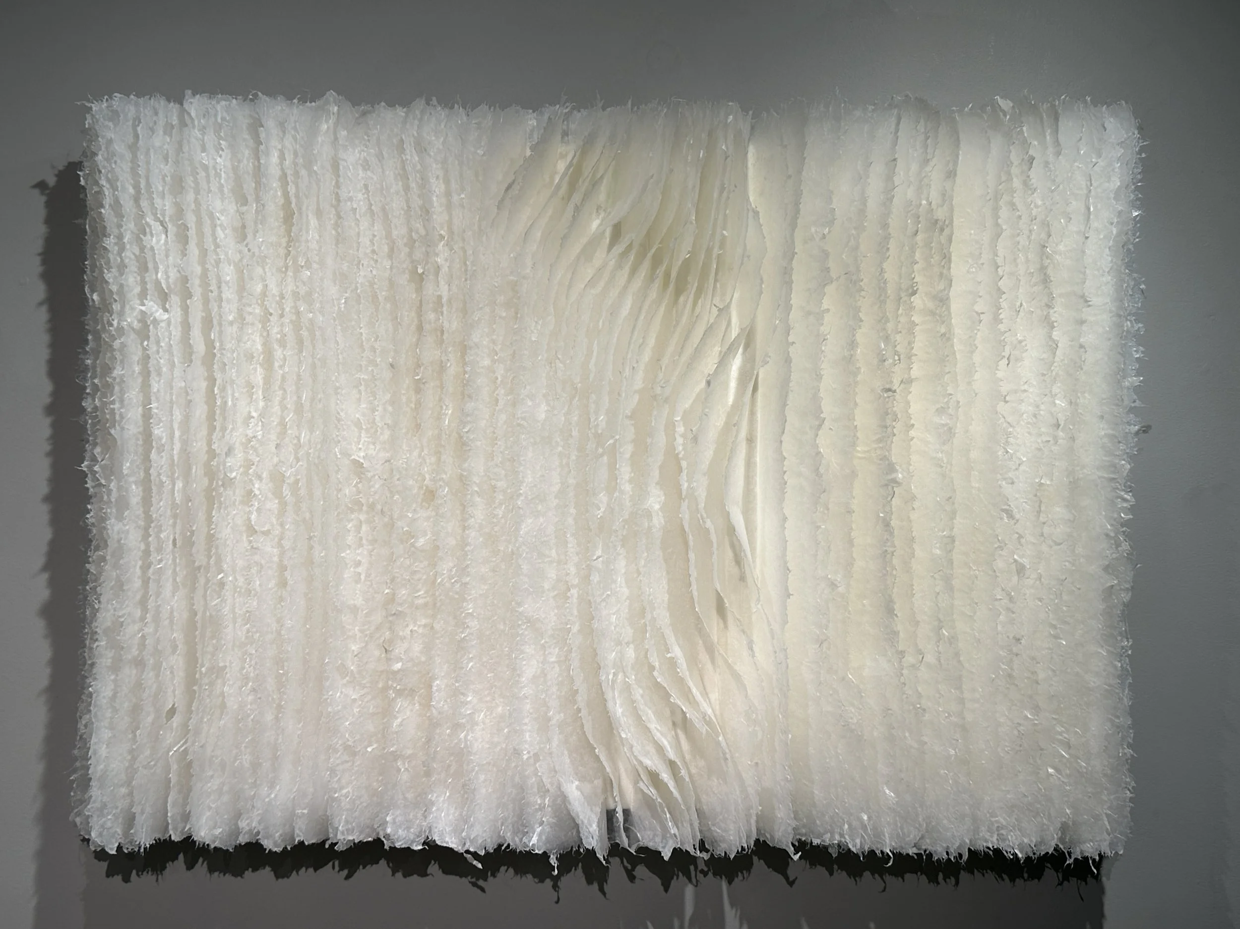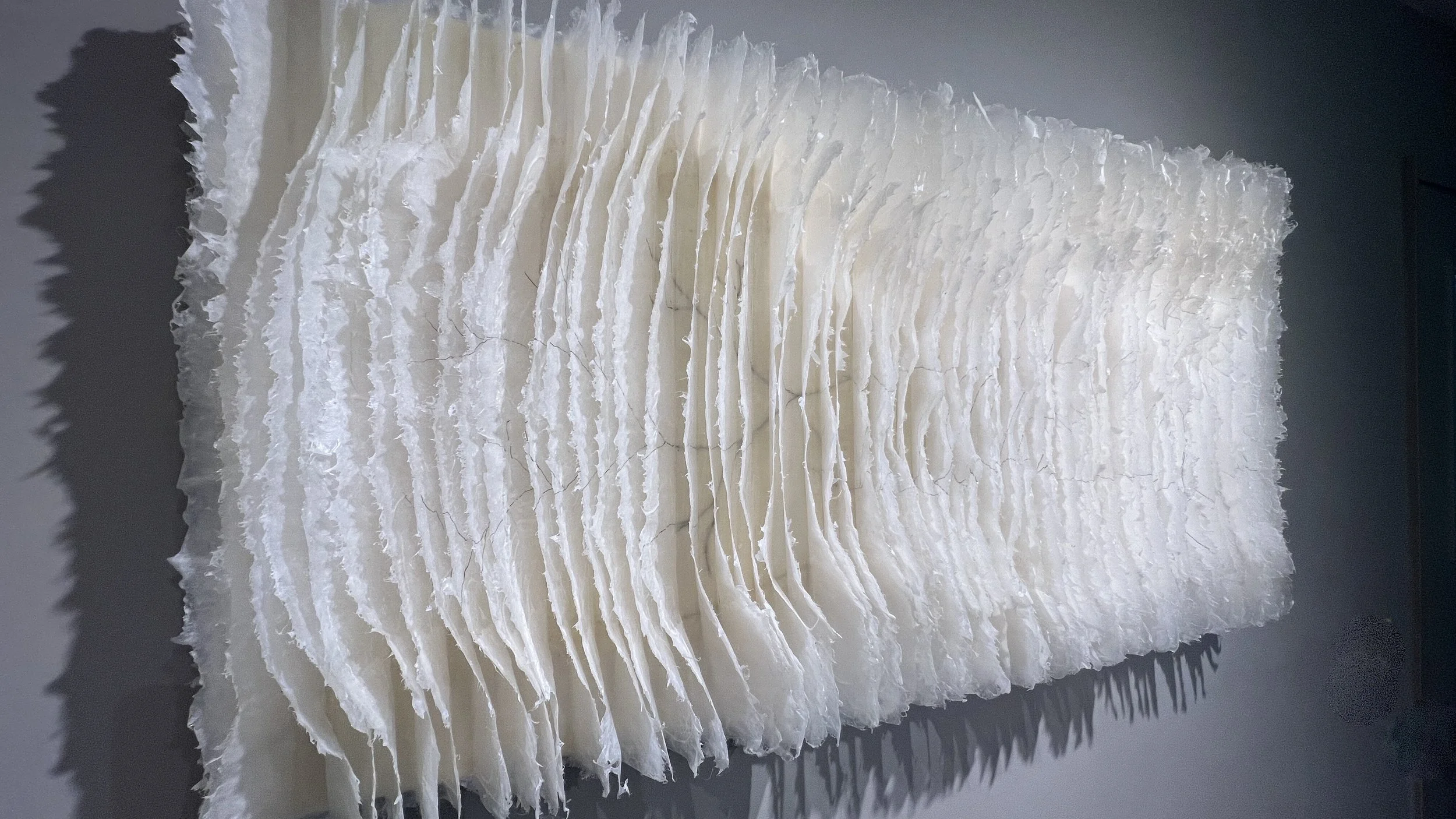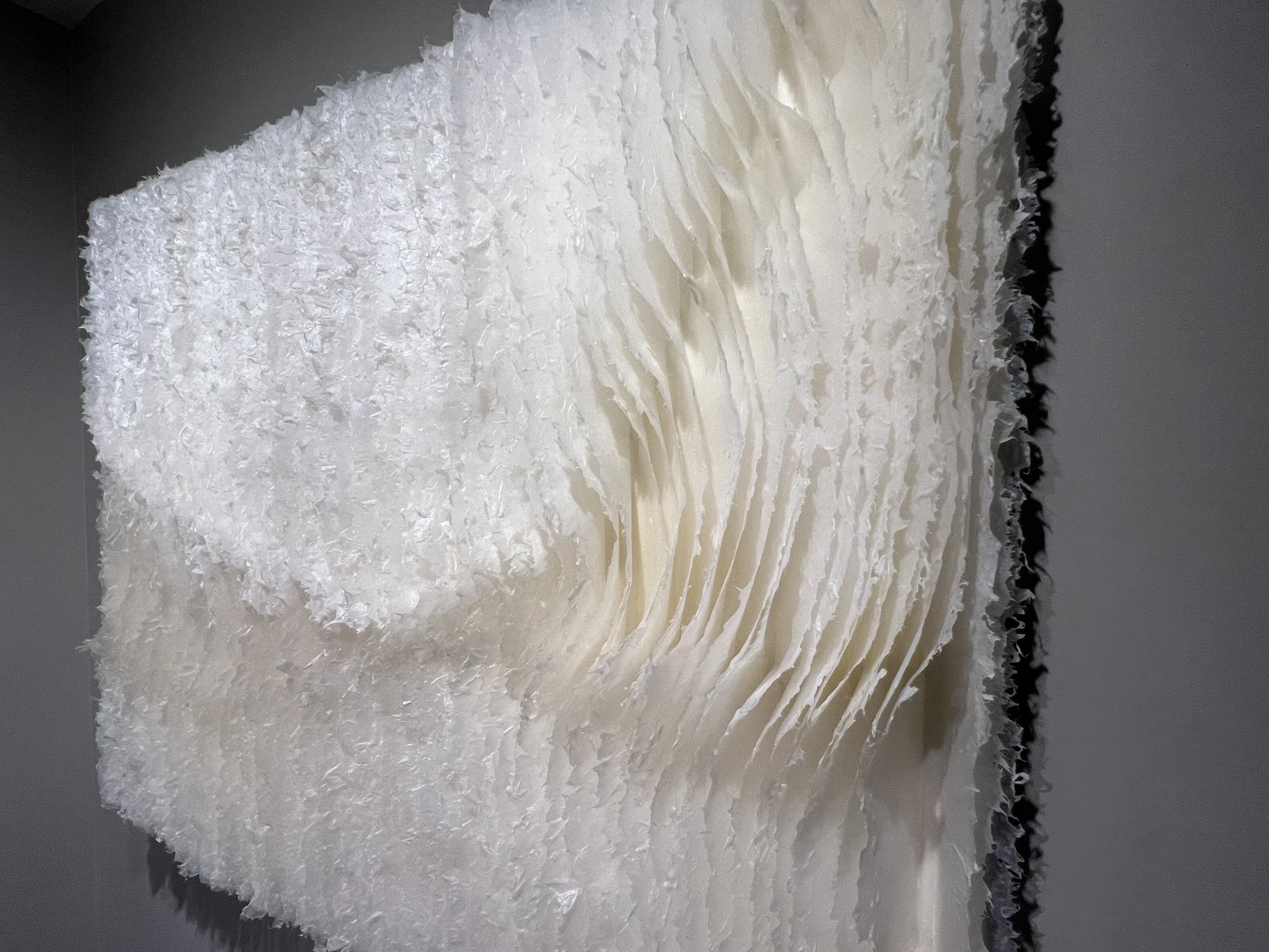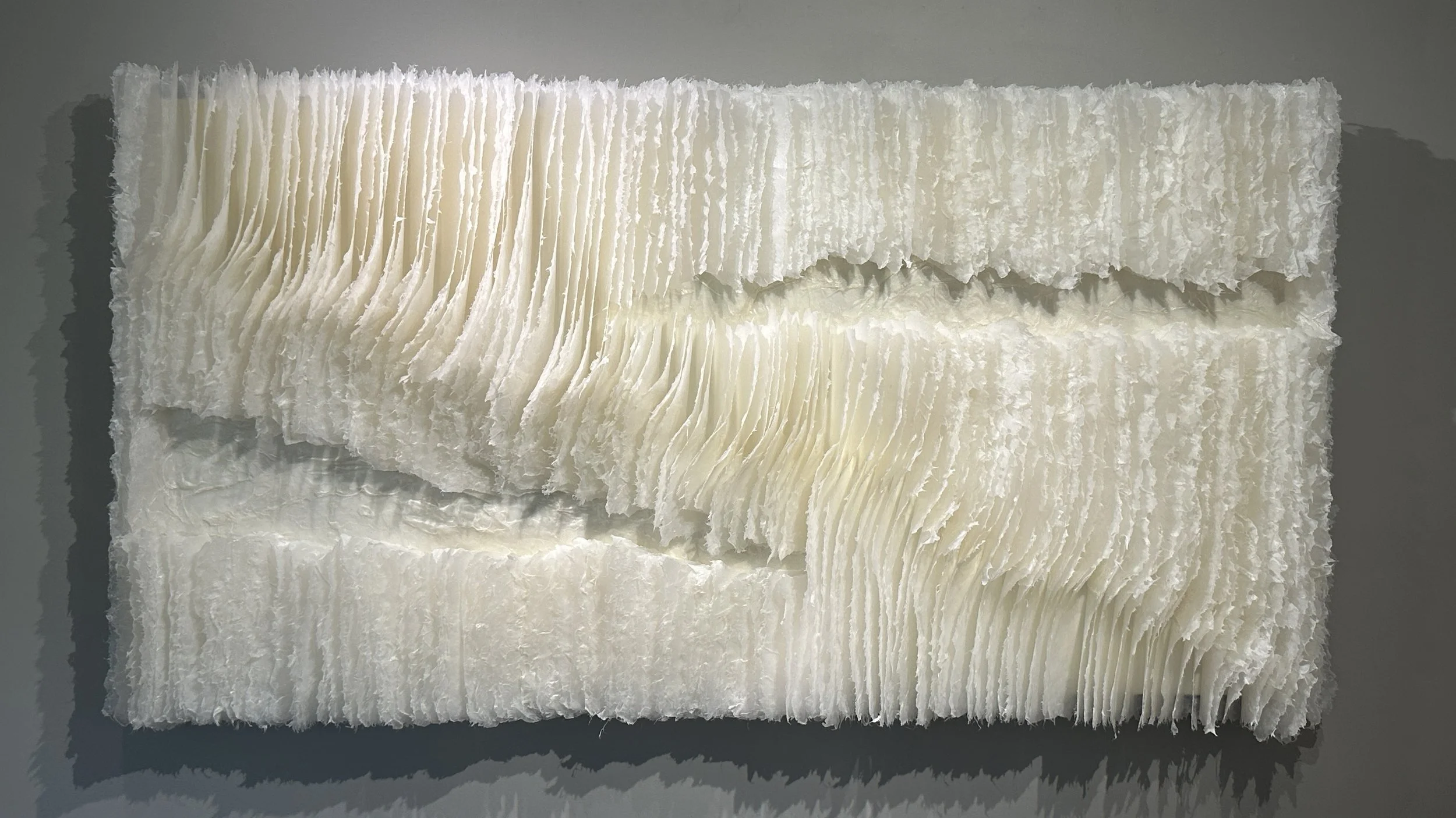 Encaustic sculpture from artist-made Kozo paper, on birch panel, 2024, 58 x 92 x 5 inches