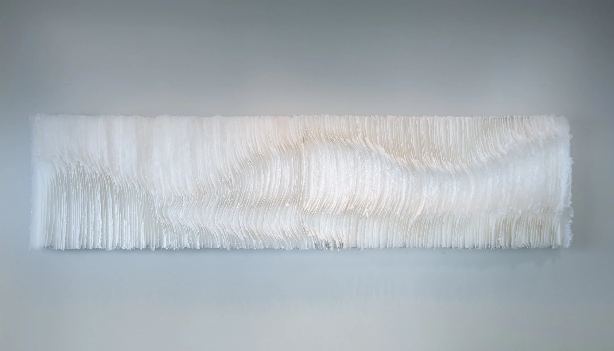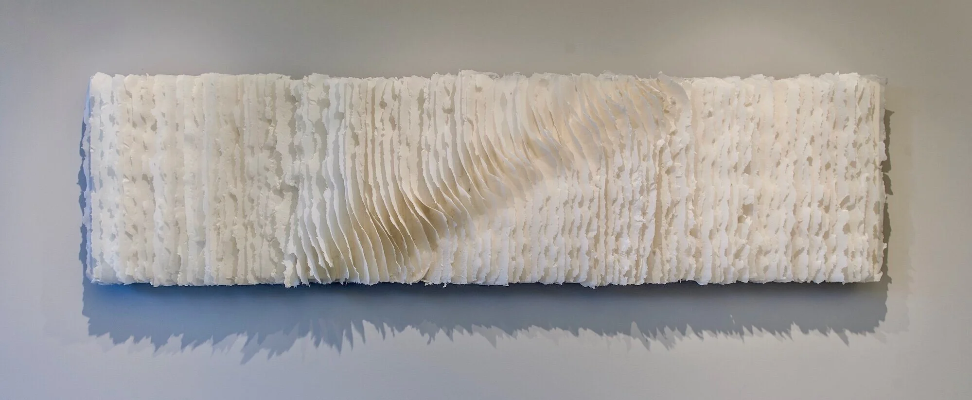 Encaustic sculpture from artist-made Kozo paper, on birch panel, 2021, 30 x 120 x 5 inches