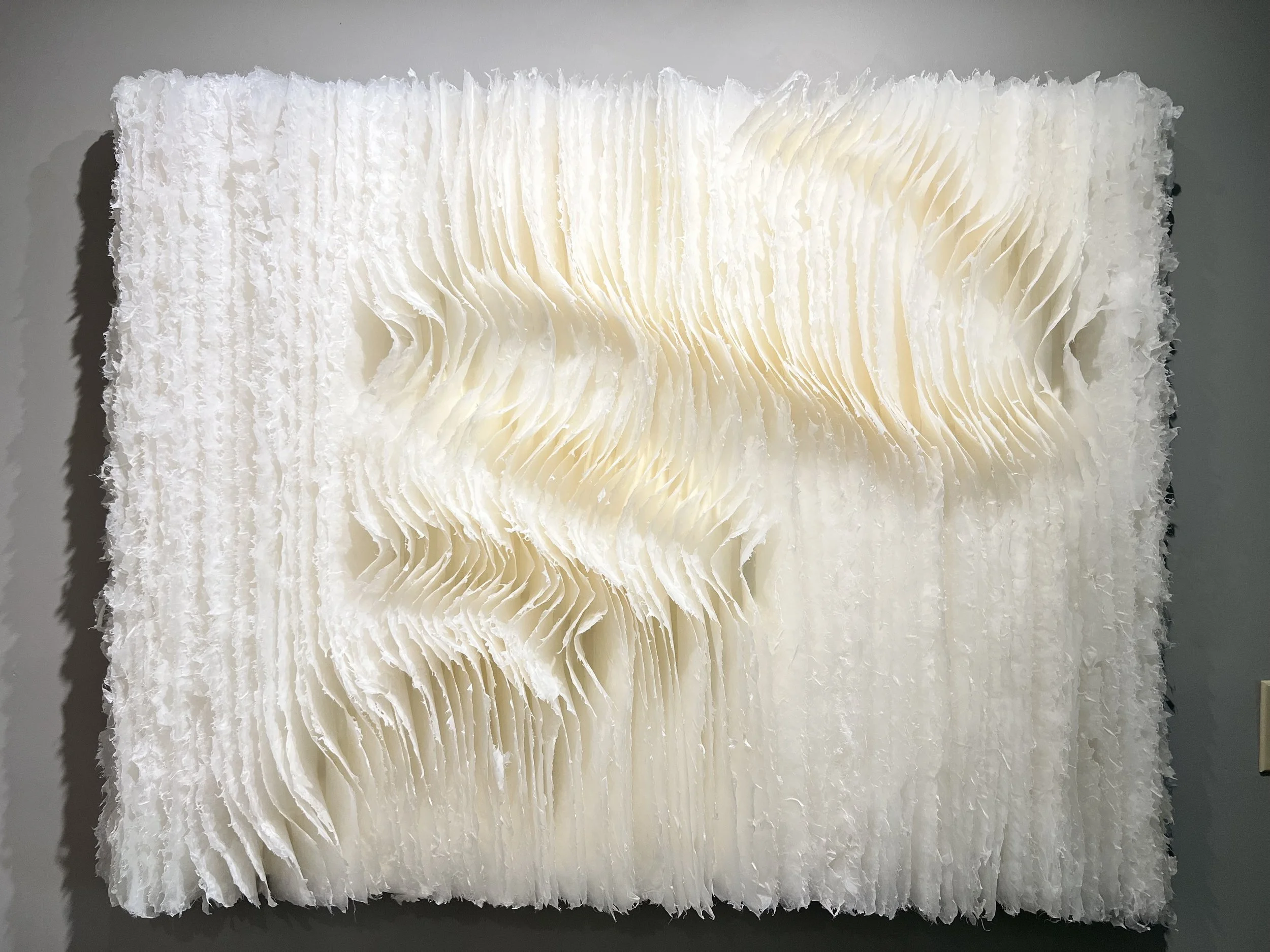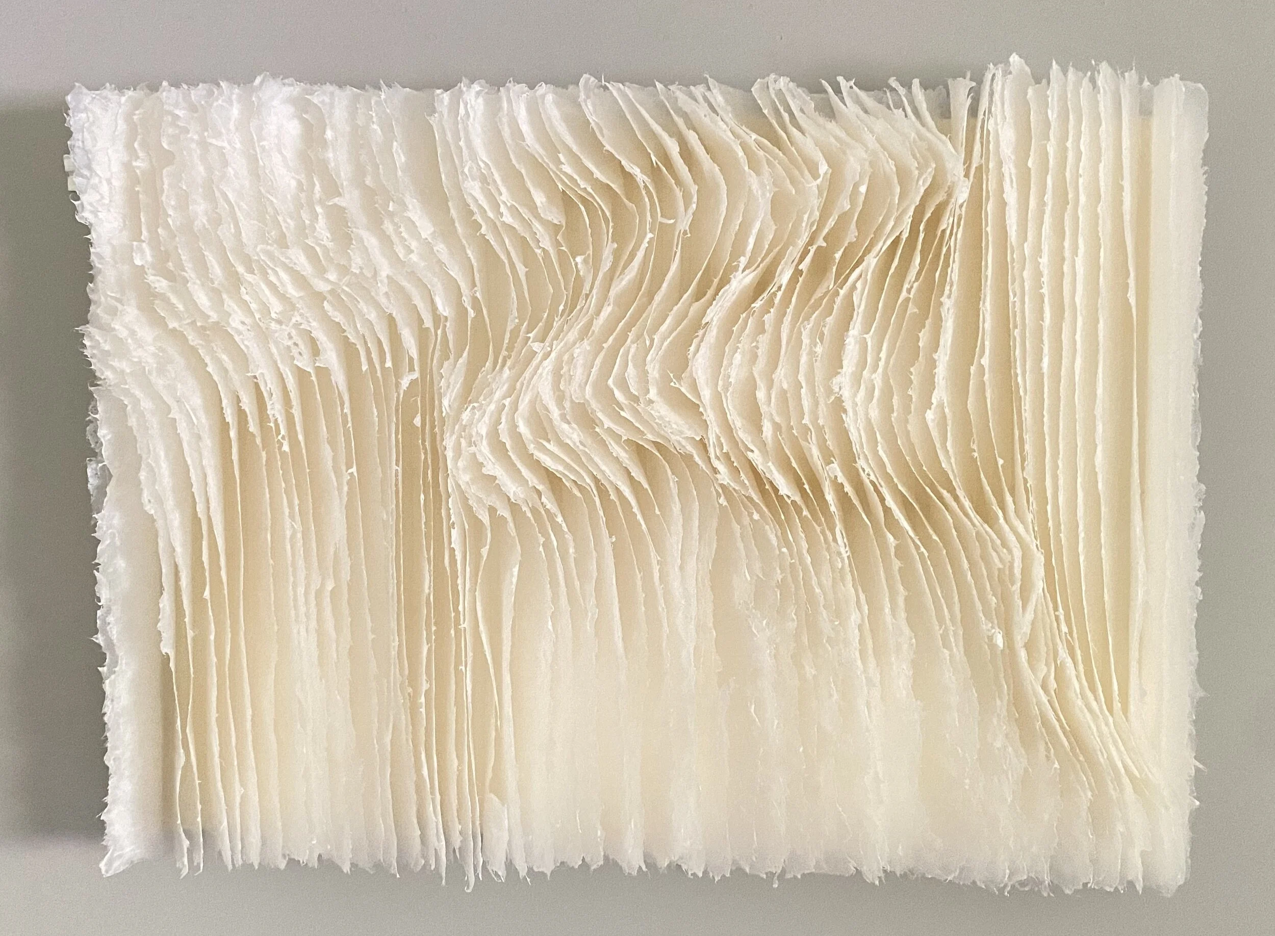 Encaustic sculpture from artist-made Kozo paper, on birch panel, 2022, 38 x 50 x 5 inches