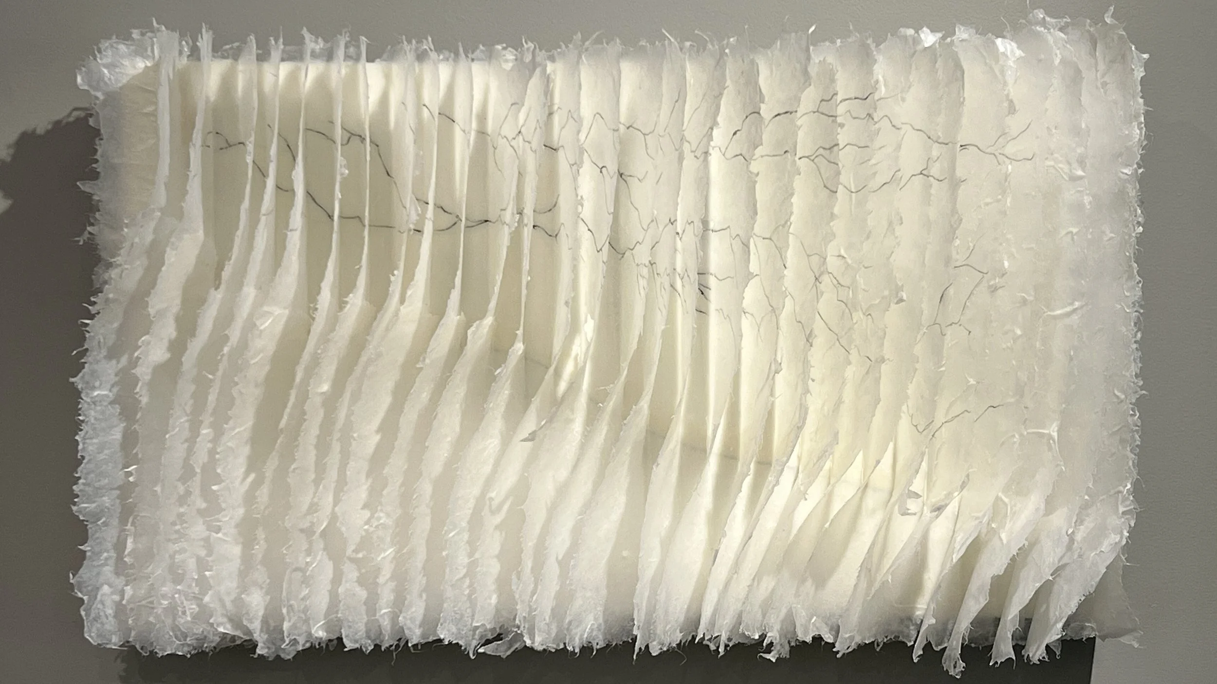 Encaustic sculpture from artist-made Kozo paper, and Sumi Ink on birch panel, 2023, 15 x 25 x 5 inches