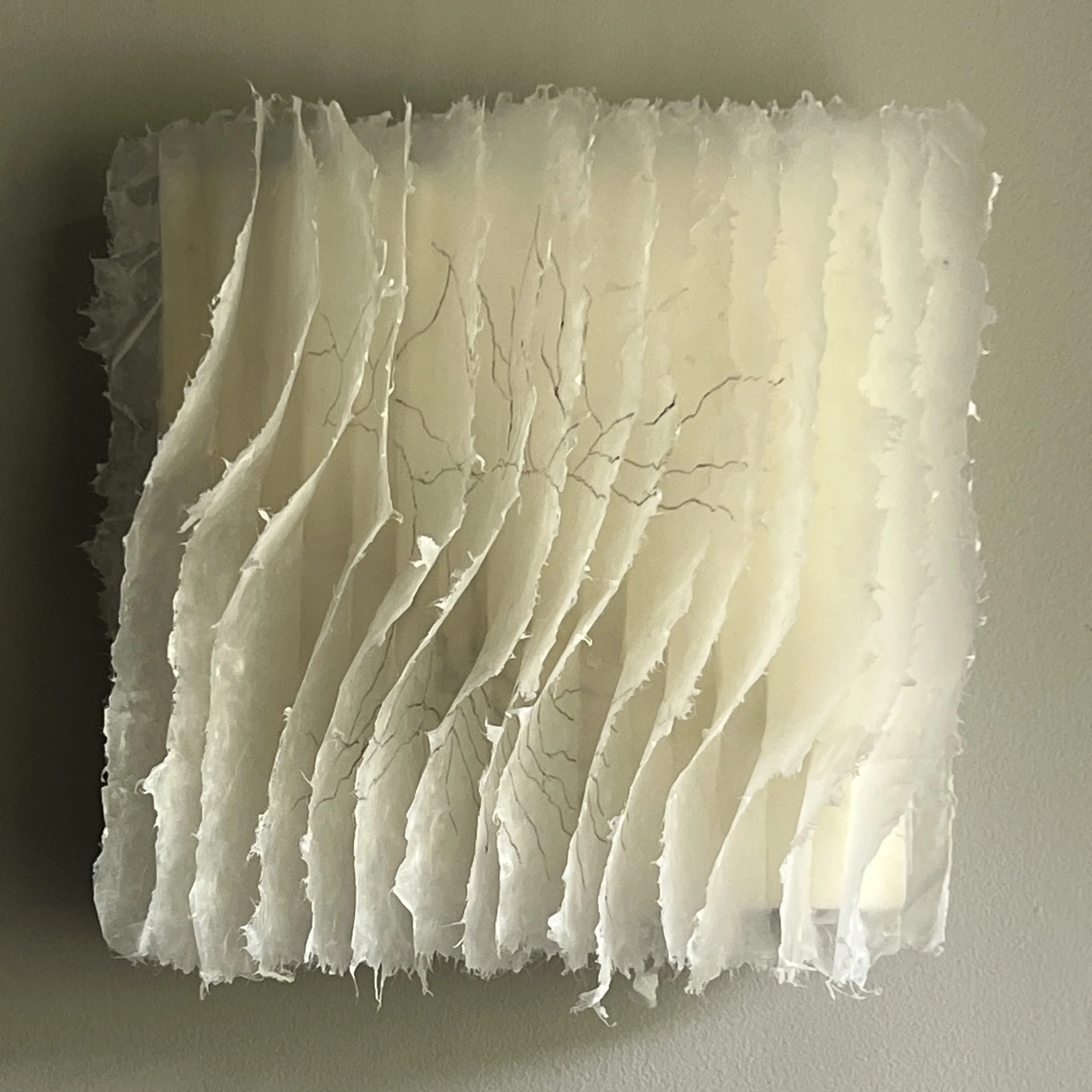 Encaustic sculpture from artist-made Kozo paper, and Sumi Ink on birch panel, 2023, 13 x 13 x 5 inches