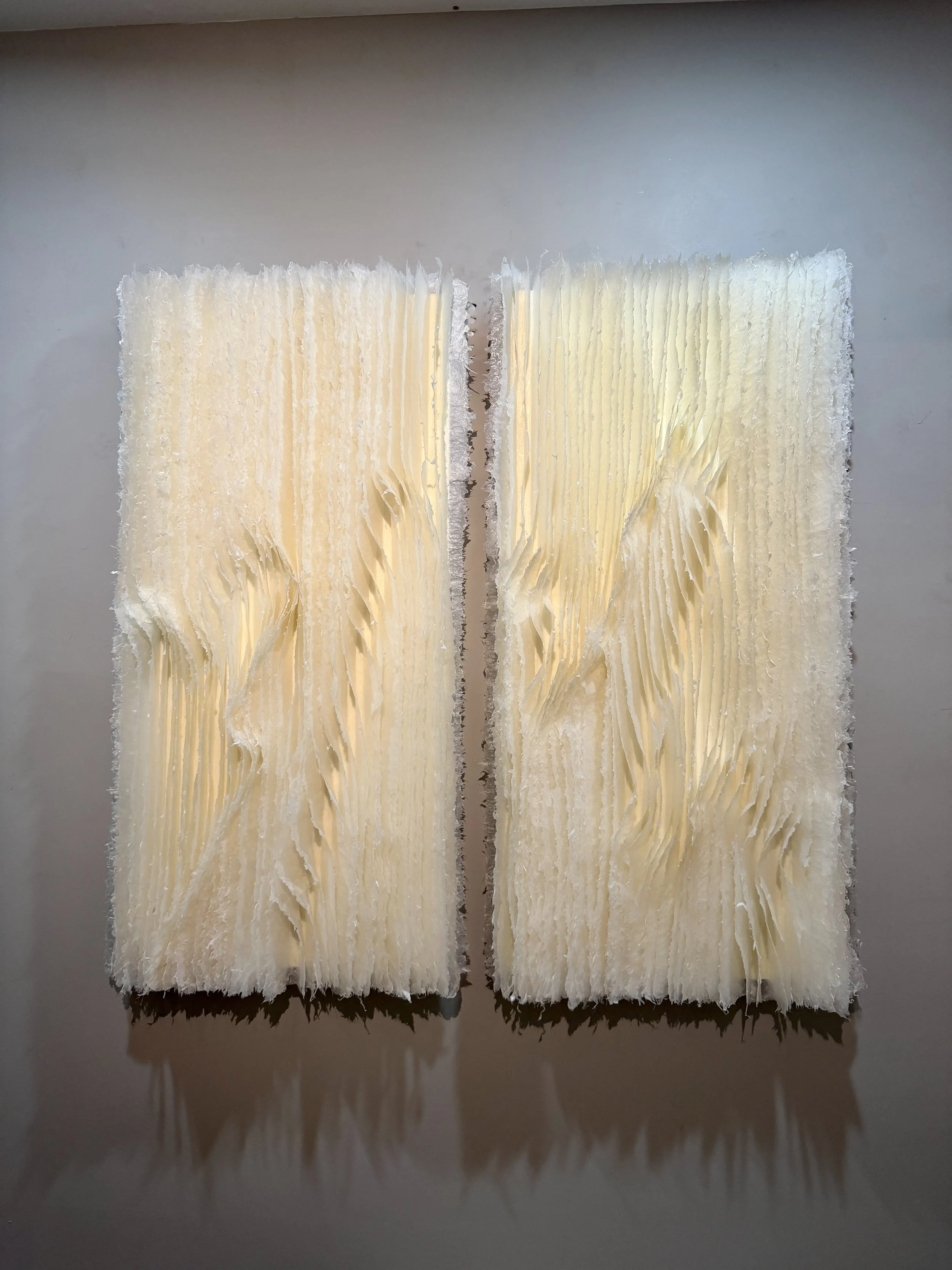 Encaustic sculpture from artist-made Kozo paper, 2022, 25 x 25 x 5 inches each